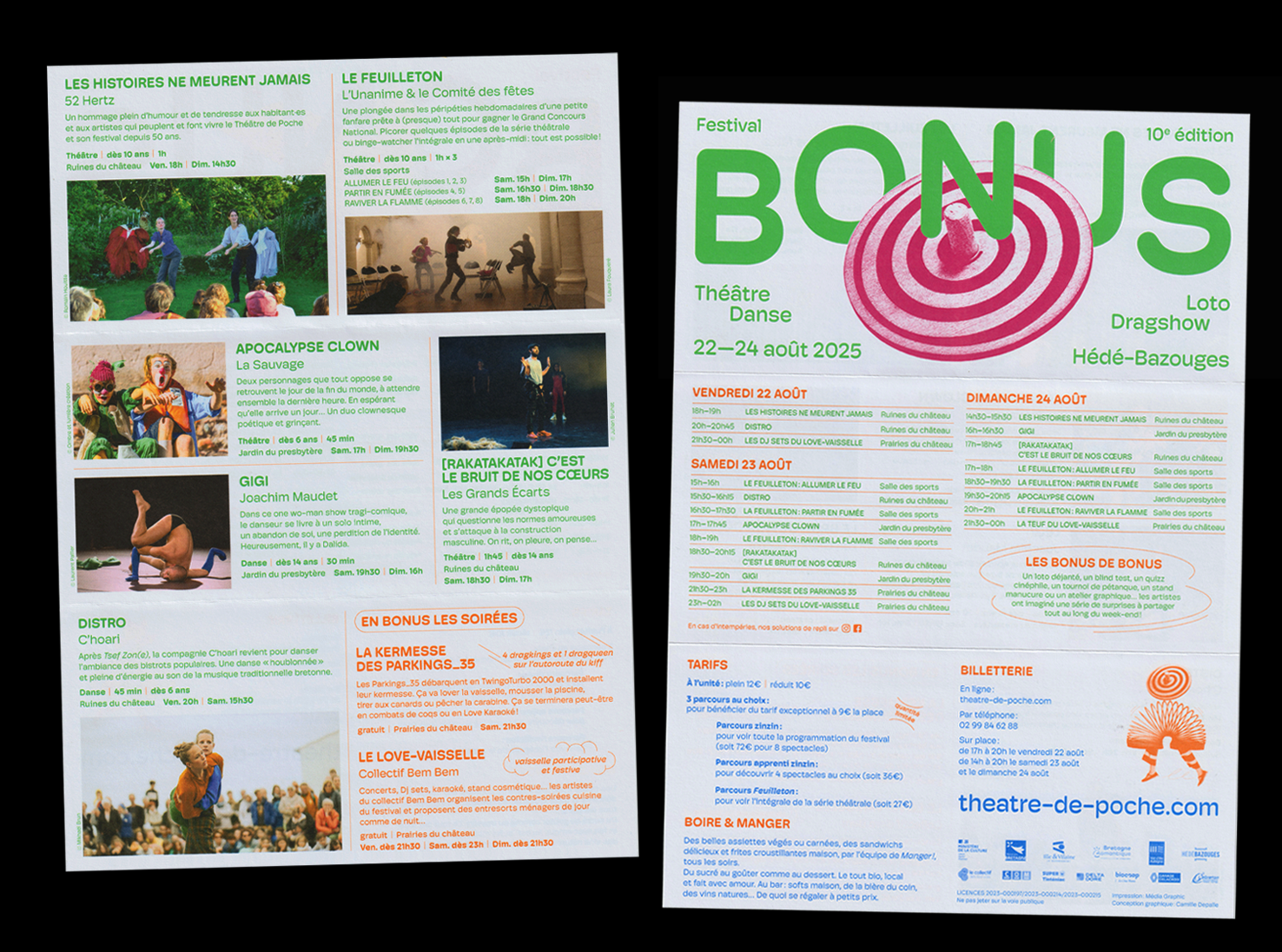Supports de programmation pour la dixième édition du festival de spectacle vivant BONUS à Hédé-Bazouges, du 22 au 24 août 2025.