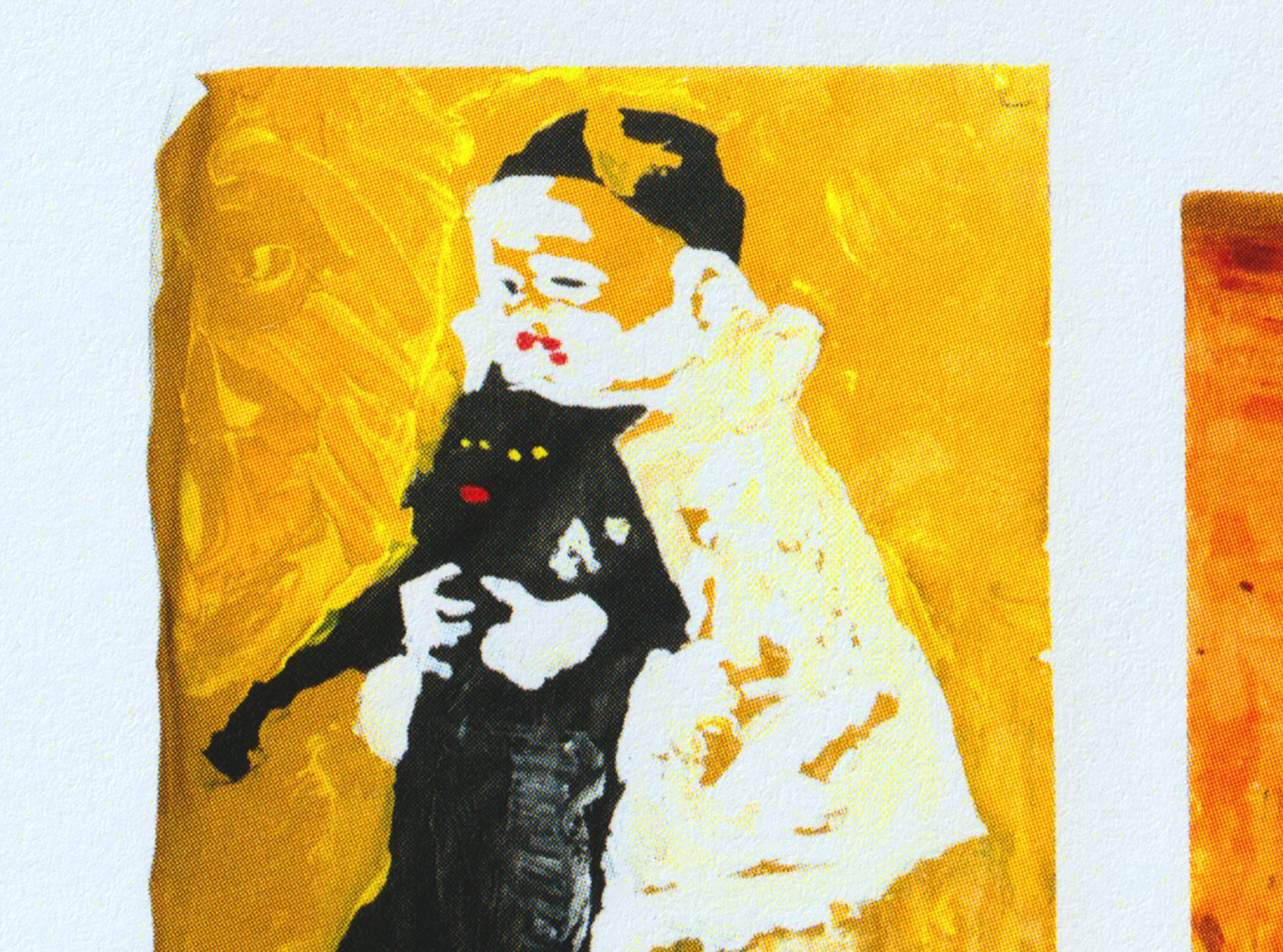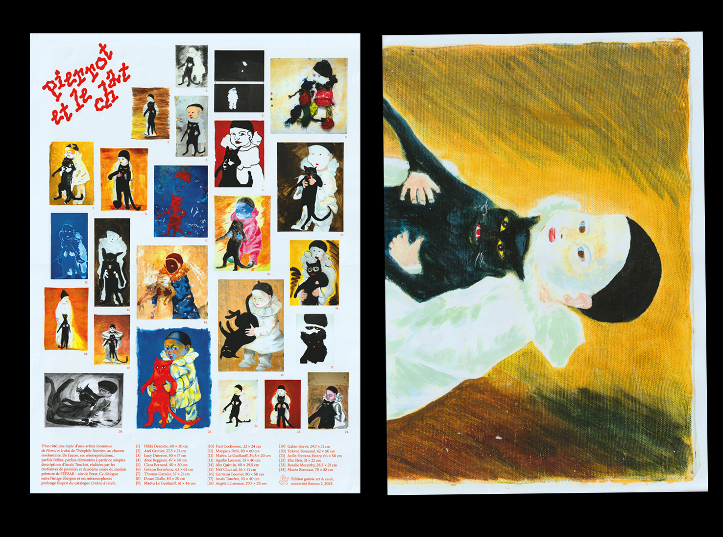 Affiche accompagnant le catalogue Croûtes à succès d’Anais Touchot, mettant en page les appropriations picturales du tableau Pierrot et le chat du peintre Théophile Steinlen par les étudiant.es de l’université Renens 2. Edition : galerie art & essai