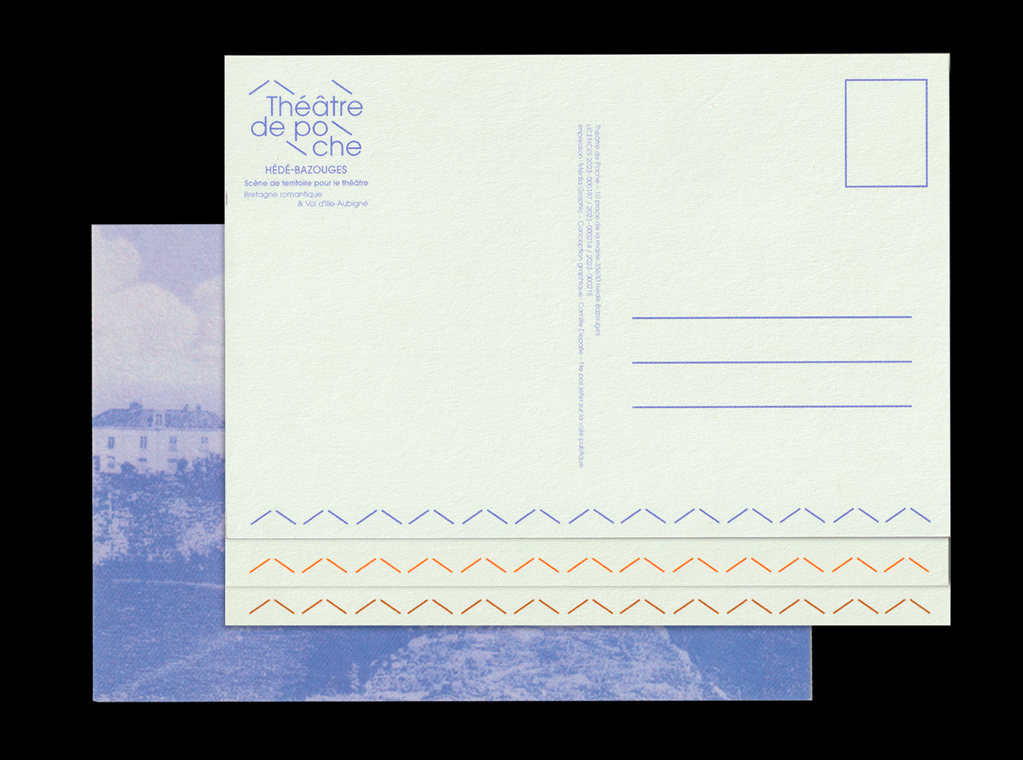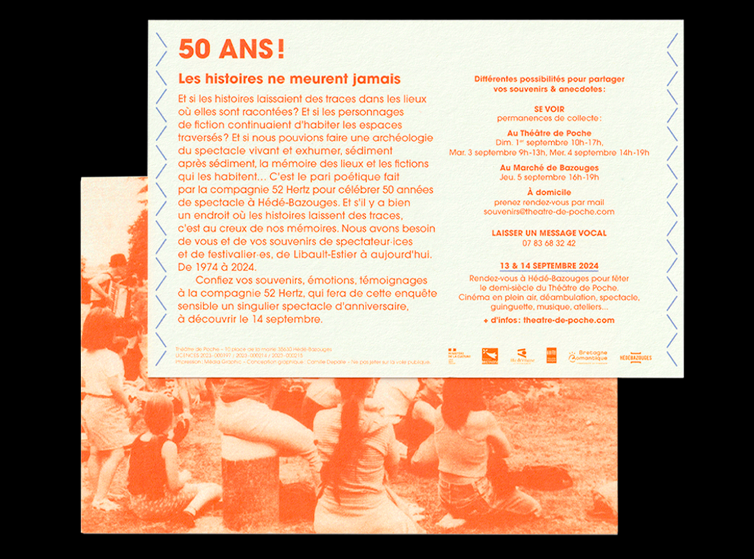 Identité visuelle du Théâtre de Poche d’Hédé-Bazouges, scène de territoire pour le théâtre, dans le cadre de la nouvelle direction de Charlotte Duchamp. Cartes postales conçues pour le spectacle Les histoires ne meurent jamais de la Cie 52 Hertz, à l’occasion des 50 ans du théâtre.